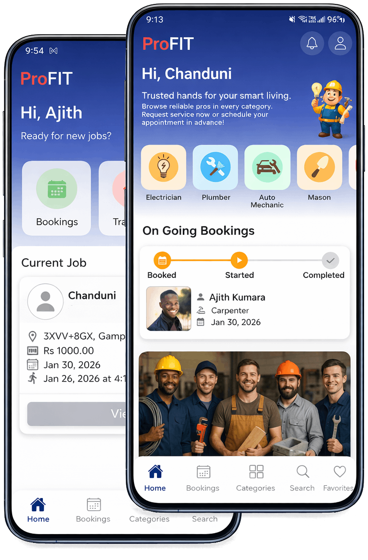 PorFIT is your all-in-one app to find skilled masons, plumbers, electricians, carpenters, and automobile engineers across Sri Lanka. Whether it’s home repair, construction, or technical maintenance, we connect you with verified professionals who deliver quality workmanship every time.